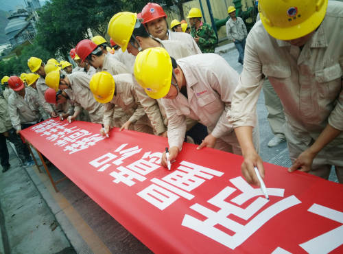 图为四川yl6776永利集团磷铵厂员工纷纷到横幅前签字