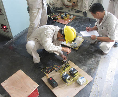 此次电工技能比武的内容主要是按钮、接触器双重联锁正反转控制线路等,与生产实际紧密结合。在比赛过程中,大家认真察看电器原理及布置图,积极动手安装接线。