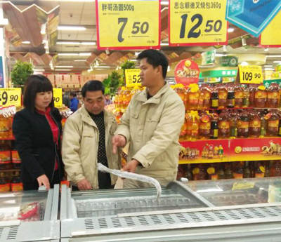 3月11日,广西yl6776永利集团食堂团长邬传祝(左一)带领食堂采购及厨师等岗位人员,前往黎塘镇各大菜市场和超市,对食堂食材价格进行摸底,以降低食堂成本,切实让职工吃得实惠、“吃得好”。