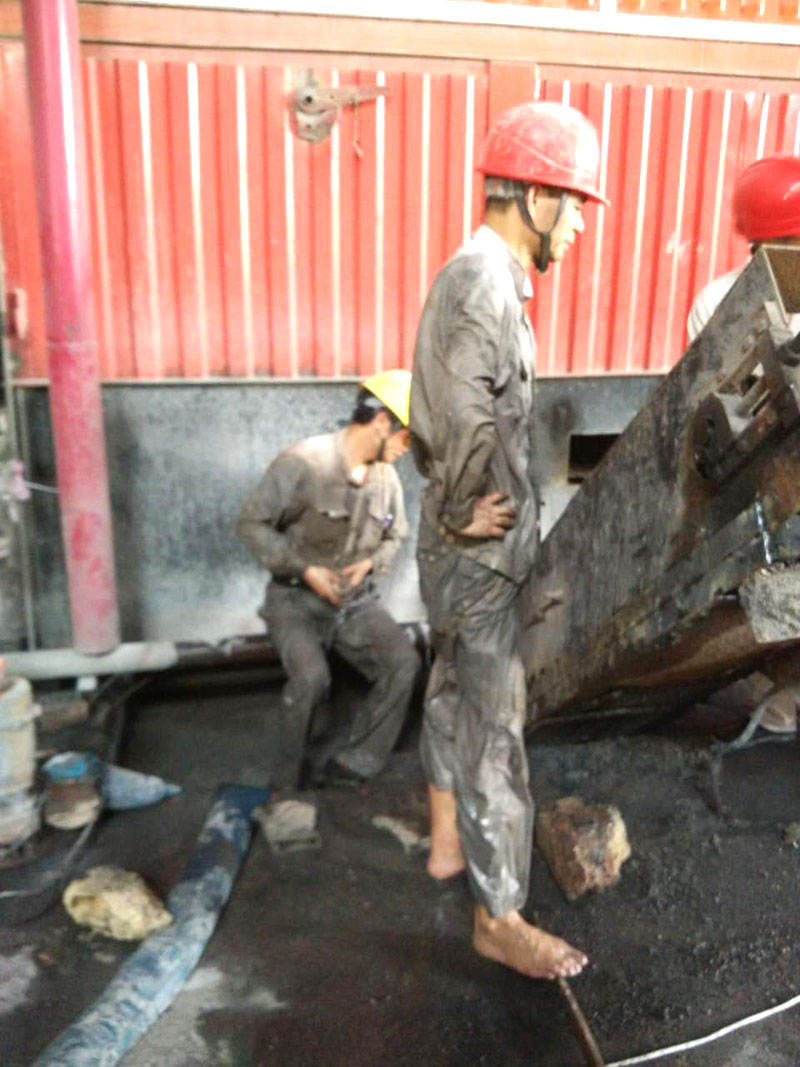 这六个小时,对厂里生产至关重要,对维修班组来说,也异常艰辛。从当天早上八点接到抢修通知后,维修班组就进入了战斗状态。维修班长黄善旭带着班组成员苏浴锋和黎勇,来到了现场查看情况。凭借丰富的实战经验和仔细的现场排查,他们发现是锅炉顶部耐火泥掉下来60公分的大块,堵塞了排渣机。维修的难度大,主要是由于排渣机在锅炉底部,而且温度达到七八十度左右,地方狭窄,只能靠人工弓腰下去,手工排渣。面对明显高于常温的水温,黄善旭和苏浴锋二人毛遂自荐,作为前锋首先进入了炉膛尾部。他们穿上厚重的工作服,下到煤渣水里面,用手一点一点把煤渣挖出来,再用风炮机把耐火泥打成小块后,用手挖出来。考虑到工作的难度,担心抢修员工的体力不支,班长当即就实施了轮班作业,把班组成员分成了几个分队,交替完成这一繁重的抢修工作。