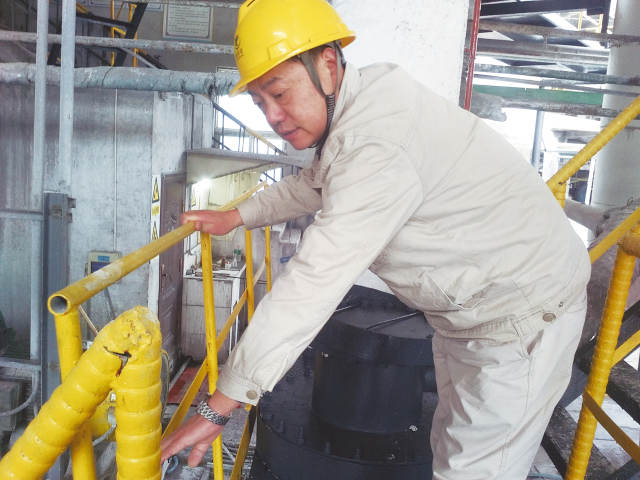 (哥哥王建军正在对车间爬梯进行安全检查)