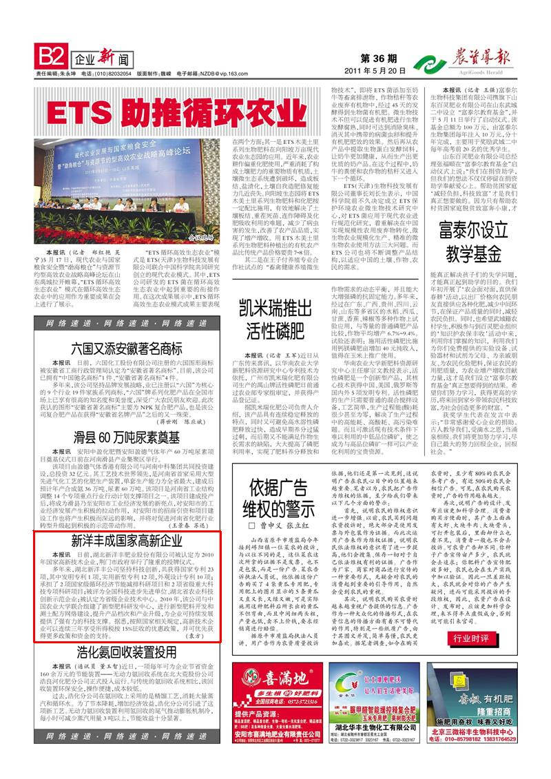 多年来,湖北yl6776永利集团公司坚持科技创新,共获得国家专利23项,其中发明专利 1 项,实用新型专利12项,外观设计专利10项;承担了2项国家级循环经济节能减排科研项目和2项省级重大科技专项科研项目;被评为全国科技进步先进单位、湖北省农业科技创新示范企业;被认定为省级企业技术中心。2010年,该公司与中国农业大学联合组建了新型肥料研发中心,进行新型肥料开发和测土配方网络建设,提升产品档次和产业升级,为企业可持续发展提供了强有力的科技支撑。据悉,按照国家相关规定,高新技术企业可以连续三年享受所得税按15%征收的优惠政策,并可优先获得更多政策和资金的支持。