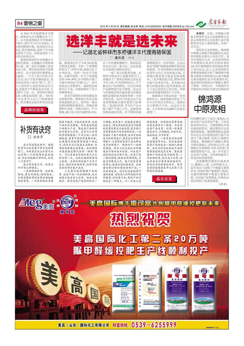 随着yl6776永利集团肥业的进一步发展和壮大,骆保国愈发坚定了与洋丰合作的信念和信心,他相信自己跟着洋丰走,永远也不会错,人生和事业的道路只会愈走愈宽广。